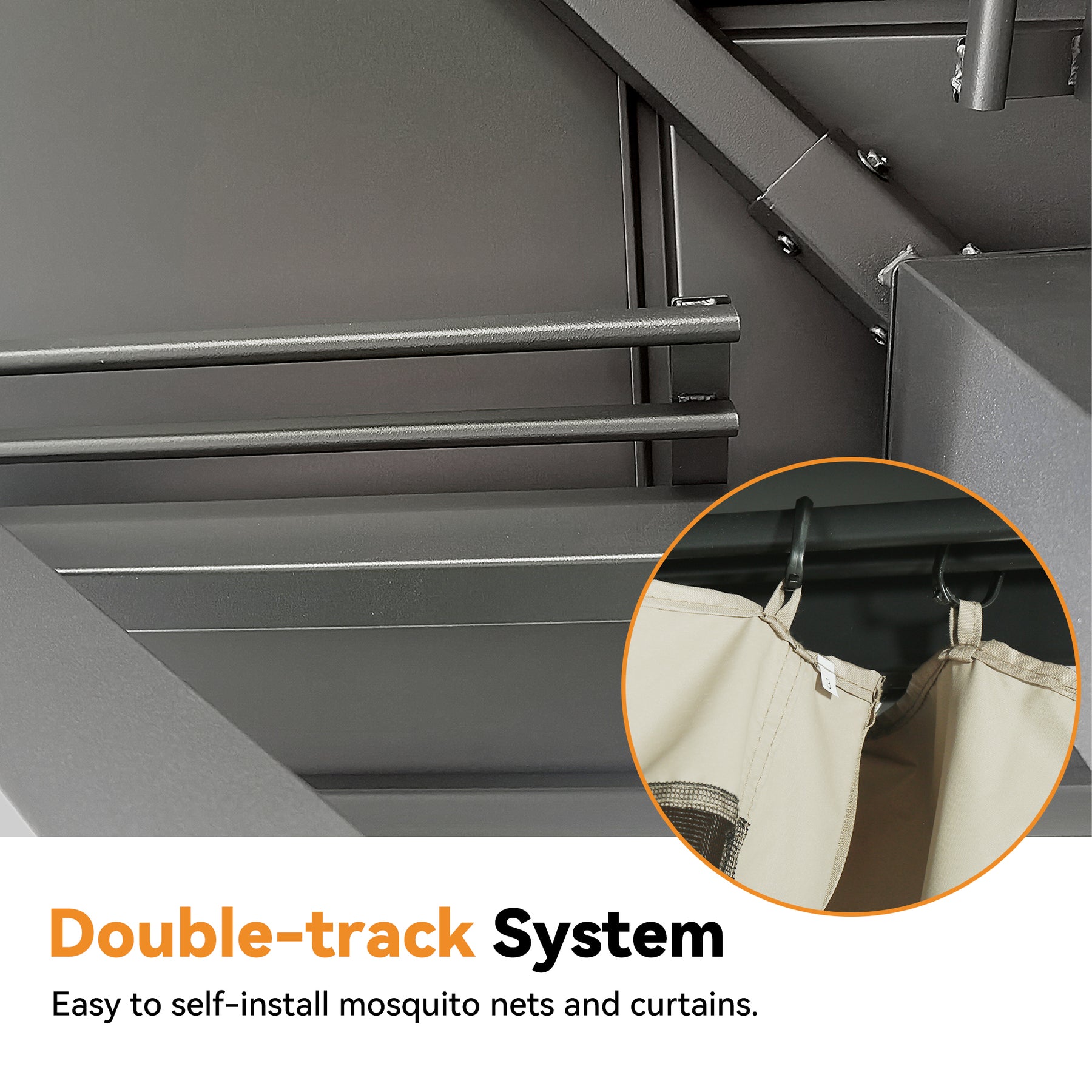 Dual-track detachable curtains and mosquito net offer privacy, airflow, and protection from sun, rain, and insects.